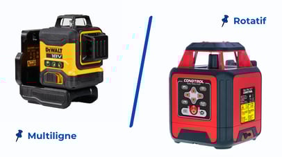 Laser rotatif : il diffuse un point lumineux à 360°, permettant de travailler sur de grandes surfaces avec une précision constante. Il est parfait pour les chantiers de grande envergure.