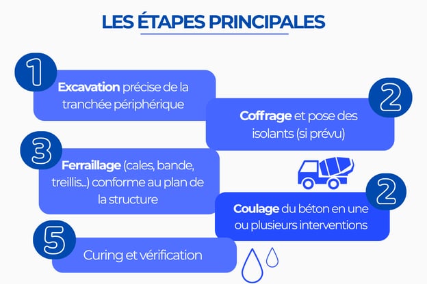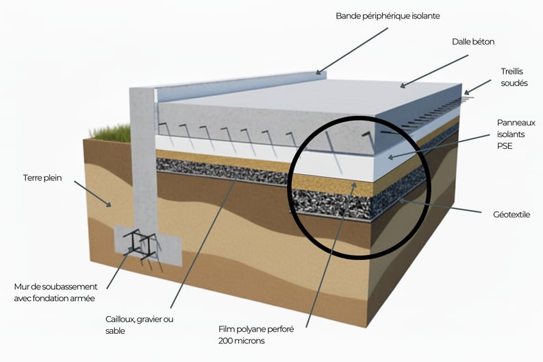 En permettant la pose d’un isolant vertical (souvent en polystyrène extrudé – XPS ou en polyuréthane haute densité), elle supprime les ponts thermiques entre dalle et murs.